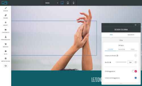 Lavorando con l’editor di Simply Site si può selezionare una qualsiasi componente di pagina e modificarla tramite gli strumenti a disposizione. L’immagine proposta di seguito mostra un menu contestuale ("Design colonna") che viene aperto dopo aver cliccato su una colonna del template.
