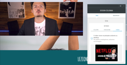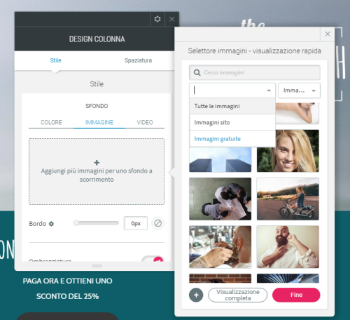 Tale menu consente di agire sullo stile e la spaziatura (in questo caso solo per Pc e tablet) dell’elemento selezionato. Agendo sullo stile si possono definire colori di sfondo, ombreggiature (interne o esterne) e colori di queste ultime, così come caricare un’immagine o un video da inserire al posto dell’elemento grafico che occupa la colonna al momento corrente. Nel caso in cui si voglia inserire un’immagine, la piattaforma offre un ricco catalogo di immagini gratuite che possono essere utilizzate liberamente per arricchire il design del proprio sito Web: