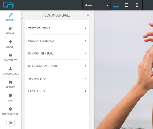 Il collegamento "Design generale" presente nel menu laterale dell’editor multischermo permette di gestire diversi aspetti inerenti il layout, a partire dal testo (paragrafi e titoli) e dai font associati ad esso. Attraverso la medesima sezione si può impostare anche l’aspetto generale dei pulsanti (stile, colore, sfondo, bordi, ombreggiature, testo ed eventuali immagini), le immagini generali del sito Web, lo stile delle righe (spaziatura righe e colonne, sfondo), lo sfondo generale e quelli per le singole pagine nonché il layout più adatto per ciascun dispositivo di visualizzazione.