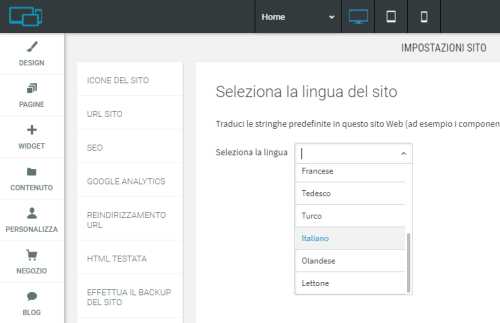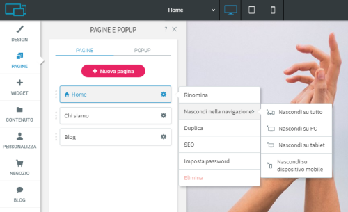 Il collegamento"Pagine" del menu laterale consente di operare sulle pagine disponibili in modalità predefinita ("Home", "Chi siamo" e "Blog") o di crearne di nuove. Cliccando sull’ingranaggio posto di fianco al nome di ciascuna pagina si apre un menu contestuale con cui si può eventualmente rinominare, nascondere (soltanto in device specifici o in tutti i dispositivi supportati), duplicare, proteggere tramite password, ottimizzare una pagina per i motori di ricerca ("SEO") o cancellarla.
