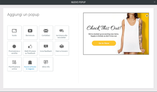 La stessa sezione consente di generare delle pagine popup, ad esempio per mostrare un messaggio di benvenuto, per proporre l’iscrizione ad una newsletter o per promuovere il lancio di un nuovo prodotto o servizio.