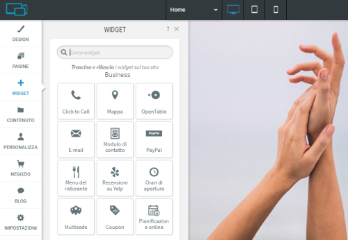 La procedura per l’inserimento di un nuovo Widget richiede poche e semplici operazioni: si clicca sul pulsante "Widget" del menu laterale, si accede all’elenco dei "Widget" disponibili, si seleziona quello desiderato e lo si trascina all’interno di una pagina nella posizione in cui lo si desidera inserire.