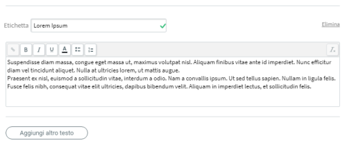 Nel caso in cui i contenuti predefiniti non siano sufficienti per i propri scopi è possibile cliccare sul pulsante "Aggiungi altro testo" per generarne di nuovi, il sistema renderà visibile una nuova textarea per la scrittura del contenuto e un campo di testo nel quale indicare il titolo ("Etichetta").