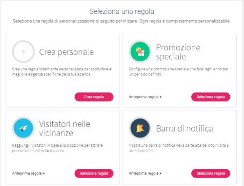 Il pulsante "Personalizzazione" del menu laterale consente di definire delle regole, queste ultime danno vita a dei comportamenti in coincidenza con il verificarsi di determinati eventi. Ad esempio, è possibile mostrare un video di presentazione ai soli nuovi utenti, definire una promozione da proporre ogni anno in un determinato periodo, rendere visibili notifiche dedicate ad utenti dotati di specifiche caratteristiche, offrire modalità di contatto durante gli orari di chiusura e mostrare particolari effetti in coincidenza con avvenimenti speciali. Simply Site presenta diverse regole predefinite che l’utente può attivare quando si possano rivelare utili per il proprio progetto.