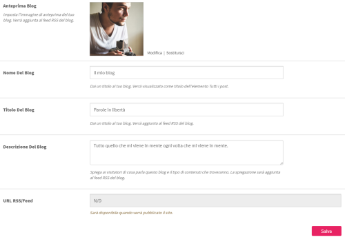 Attraverso queste impostazioni l’utilizzatore può definire un’immagine di anteprima del blog (anche scegliendola tra quelle offerte gratuitamente da Register.it), associare un nome e un titolo al blog, fornirne una descrizione nonché indicare l’URL dell’eventuale Feed RSS per gli aggiornamenti.