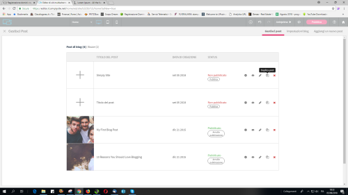 Il pulsante "Gestisci post" permette di visualizzare un elenco dei post già creati (Simply Site offre alcuni modelli di base da cui partire per realizzare i propri contenuti), ciascuno di essi è modificabile, duplicabile per la creazione di un ulteriore post o eliminabile. Di ogni post la lista riporta l’immagine di anteprima (quando presente), il titolo, la data di creazione e lo stato corrente che può essere "Pubblicato" o "Non pubblicato"; si possono pubblicare i post non pubblicati in qualsiasi momento, così come se lo si desidera si ha sempre l’opportunità di rimuovere un post dallo stato di pubblicazione.