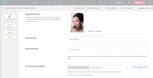 Cliccando sull’icona per la modifica di un post lo si può rieditare e, dalla stessa interfaccia, è possibile cliccare su "Impostazioni post" per effettuare ulteriori interventi come l’aggiunta (o la sostituzione) dell’immagine di anteprima, la modifica dei contenuti, la definizione di un permalink associato all’articolo, l’aggiunta di tag (sostanzialmente dei collegamenti a post di argomento comune) e l’eventuale modifica del nome dell’autore. Di un post selezionato si può modificare anche la data di pubblicazione.