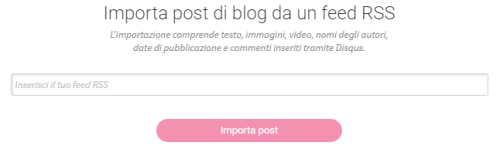 Nel caso in cui non si volesse partire da zero nella creazione di un post, è possibile ricorrere allo strumento per l’importazione da Feed RSS che consente di acquisire testi, immagini, video, date di pubblicazione, nome autore e persino commenti (se pubblicati tramite la piattaforma Disqus) di un post preesistente.