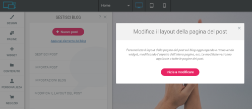 Se si desidera modificare il design della pagina di un post è possibile cliccare sul collegamento "Modifica il layout del post" presente nel sotto-menu "Gestisci blog", questo consente di intervenire su tutti gli elementi di pagina utilizzando gli strumenti visti in precedenza per la personalizzazione dei layout, ivi compresa l’aggiunta di Widget.
