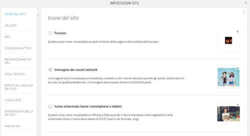 Il percorso "Impostazioni > Icone del sito" consente di effettuare l’upload di alcune immagini con cui valorizzare ulteriormente la propria presenza online. Gli elementi definibili sono in questo caso: