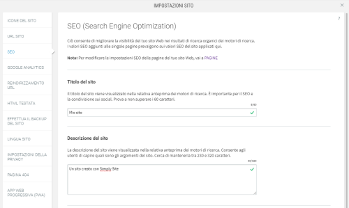 - SEO: le pagine Internet create con Simply Site sono ottimizzabili per i motori di ricerca, è possibile inserire all’interno di esse il codice di Google Analytics e sfruttare la sezione "SEO" per migliorarne il posizionamento;