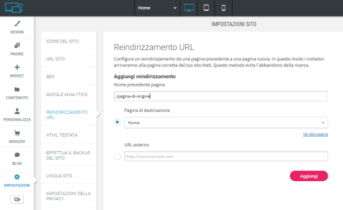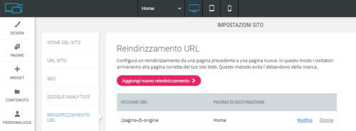 La piattaforma consente di configurare un reindirizzamento da una pagina Web precedente ad una nuova, con questa operazione i visitatori di un sito Internet verranno indirizzati verso la pagina corretta, evitando eventuali abbandoni e passaggi su risorse altrui. Per definire un redirect si utilizza la scheda "Reindirizzamento URL" che permette di inserire il nome della pagina precedente e scegliere se spostare la navigazione su una pagina di destinazione o verso un URL esterno.