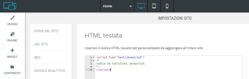 Pensata per chi può vantare competenze riguardo ai linguaggi per lo sviluppo Web, l’opzione "HTML testata" fornisce un editor di codice con cui digitare o incollare istruzioni HTML e JavaScript per dar luogo a comportamenti specifici.