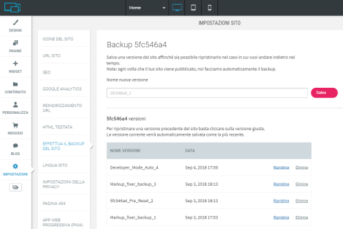 La funzione di "Backup" consente di effettuare la copia di sicurezza di una versione del sito Web in modo da poterla ripristinare nel caso lo si desideri o se ne abbia la necessità. Ogni volta che un sito viene pubblicato il servizio esegue automaticamente un backup utilizzabile per il restore.