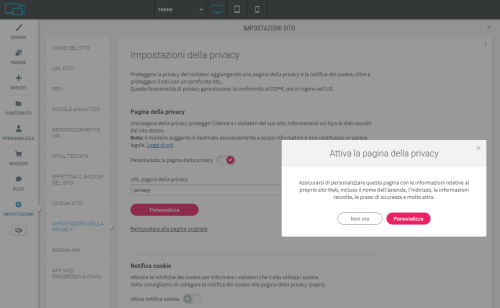 In questa sezione si possono abilitare la "Pagina della Privacy" e la "Notifica cookie" per poi modificarle come qualsiasi altra pagina. Nel caso della prima si tenga contro che il modello suggerito dal servizio ha esclusivamente un scopo informativo e non deve essere interpretato come un parere legale valido per qualsiasi tipologia di attività; la "Notifica cookie" offre invece maggiore conformità quando linkata alla relativa informativa.