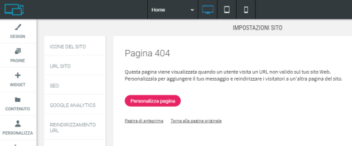 La Pagina 404 viene visualizzata quando un utente visita un URL non valido sul sito Web corrente. Con gli strumenti di Simply Site è possibile personalizzarla in modo da aggiungere un proprio messaggio e reindirizzare i visitatori verso un’altra pagina del sito. Per crearne una si deve cliccare sul link "Pagina 404" per poi optare per "Personalizza pagina".