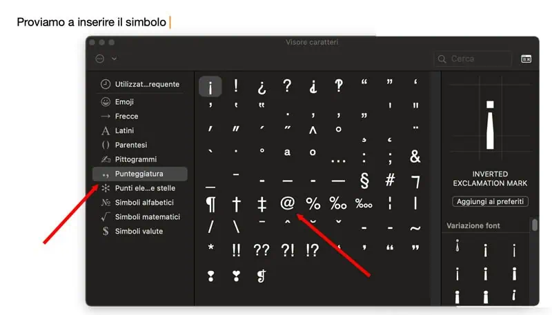 Dal menu laterale di sinistra selezionate la voce “Punteggiatura” e cliuccate sul simbolo della chiocciola per inserirla nel punto in cui si trova il cursore.