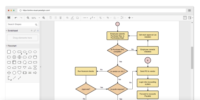 Il tool di Visual Paradigm consente di creare flow chart in modo semplice e collaborativo. Per creare un diagramma รจ possibile scegliere tra uno dei piรน di 200 template disponibili. Trascina e rilascia le forme per creare i tuoi diagrammi in pochi clic e posiziona gli elementi in modo ordinato grazie all’aiuto delle guide di allineamento. Una volta completato il lavoro sarร possibile esportare il diagramma sottoforma di file nei formati PNG, JPG, GIF, SVG. Il sistema integra anche strumenti di collaborazione grazie ai quali sarร facile lavorare in team.