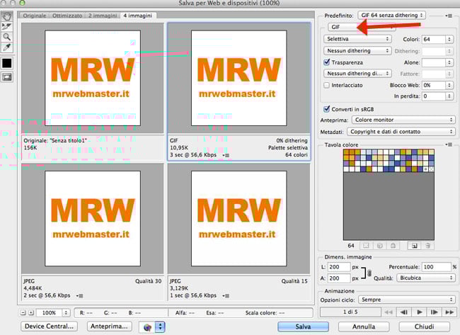 Nella finestra che si apre dovremo selezionare il formato GIF (menu a tendina in alto a destra) e cliccare sul Salva.