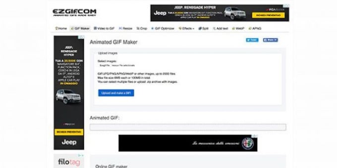 Sul il sito Ezgif.com รจ possibile creare immagini animate senza dover scaricare nulla sul proprio computer. ร sufficiente caricare le immagini che si desidera utilizzare, per le varie slide della propria animazione, e cliccare sul pulsante “Upload and make a GIF”. ร possibile caricare un massimo di 2000 immagini per un totale di 100 MB. I formati ammessi per le singole slide sono gif, JPG, PNG, APNG e WebP.