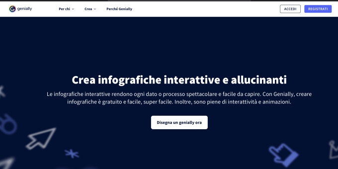 Attraverso il sito genail.ly รจ possibile creare svariati tipi di infografiche, diagrammi e linee temporali. La particolariotร  di questo tool รจ che รจ in grado di generare non semplici immagini ma vere e proprie infografiche interattive, con svariati effetti e animazioni. Il risultato sarร  di sicuro impatto!
