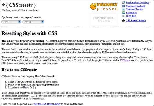 Come abbiamo visto, ci sono diverse soluzioni per il CSS Reset delle impostazioni di default dei vari browser. Per confrontare i vari codici e comprendere meglio le differenze, vi invito a visitare il sito CSS:Resetr, che consente di visualizzare “al volo” l’effetto prodotto dai vari codici sugli elementi di una pagina web.