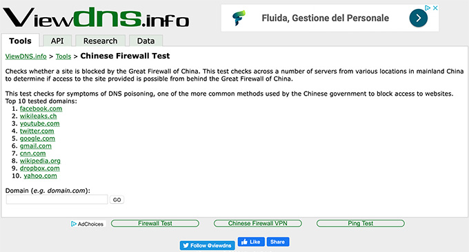 Attraverso questo strumento on-line possibile verificare, in modo estremamente semplice, la raggiungibilità o meno di un sito web all’interno del territorio cinese.