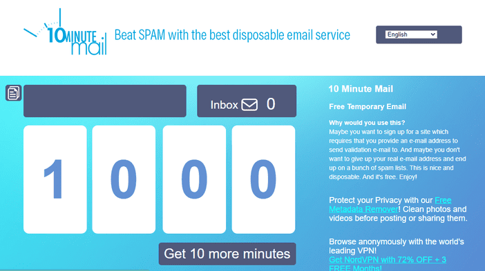 Denominato anche Drop Mail 10, questa piattaforma, come descritto perfettamente nel proprio nome, offre un servizio per un tempo limitato di 10 minuti (più eventuali altri 10 minuti aggiuntivi). Puoi usufruire di questo servizio direttamente dal sito web 10minutemail.com, accessibile da qualsiasi dispositivo.