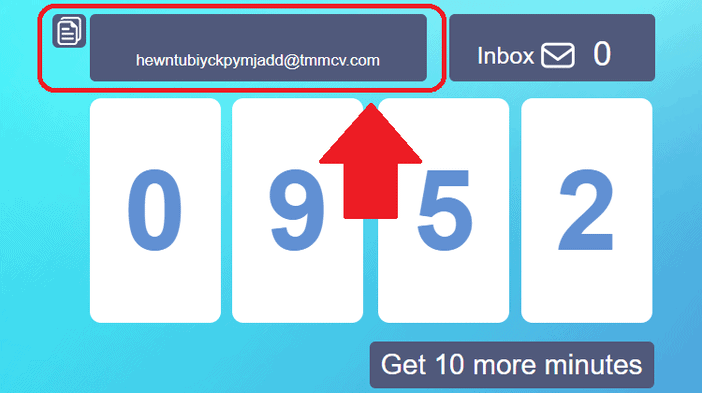 All’accesso alla pagina verrà generato automaticamente un indirizzo email temporaneo da copiare e incollare nel campo di registrazione del sito web al quale vuoi registrarti, e partirà subito il conto alla rovescia dei minuti di validità rimanenti di quell’indirizzo email.