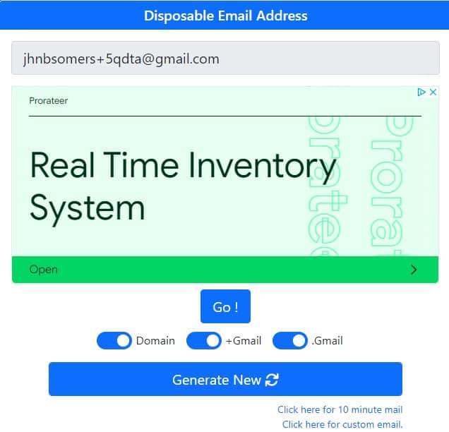 È un semplice servizio che ti permette di creare una casella di posta elettronica, della durata di 10 minuti, con dominio Gmail. Collegandosi al sito web, si aprirà la pagina con un indirizzo email provvisorio random, a questo punto ti basterà cliccare su “Generate New” e ti verrà assegnata una email @gmail.com. Cliccando su “click here for 10 minute mail” potrai usufruire della tua casella di posta e partirà un conto alla rovescia che ti indicherà il tempo di vita rimanente per quell’indirizzo.