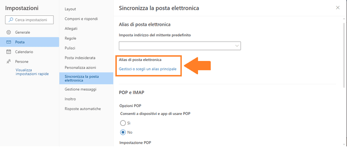 Si aprirà una sottofinestra, a questo punto seleziona “posta”, poi “sincronizza la posta elettronica” e “Gestisci o scegli un alias principale”.