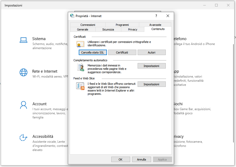 Se invece si desidera ripulire la cache SSL lo si deve fare direttamente dal sistema, su Windows 10 si può cliccare su “Impostazioni” e, tramite il modulo di ricerca, digitare “Opzioni Internet”. Si apre così una finestra di “Proprietà – Internet” nella quale selezionare la scheda “Contenuto”.