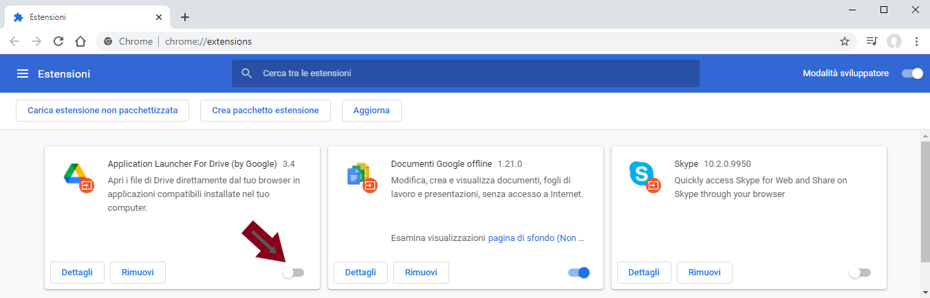 Disattivazione delle estensioni di Chrome