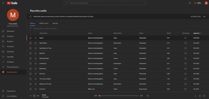 La YouTube Audio Library รจ un servizio gratuito di musica Royalty Free che consente agli utenti di scaricare e utilizzare brani musicali nei propri video YouTube. Questo servizio รจ stato creato per fornire ai creatori di contenuti per YouTube una vasta selezione di brani musicali di alta qualitร da utilizzare come colonna sonora dei loro video.