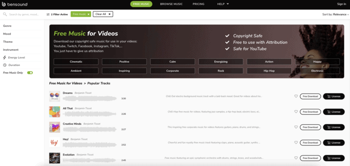 Bensound รจ un sito web specializzato in musica Royalty Free che offre brani musicali sia gratuiti che a pagamento per l’utilizzo in progetti multimediali come video, podcast, film e presentazioni.
