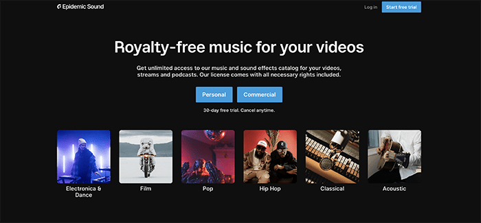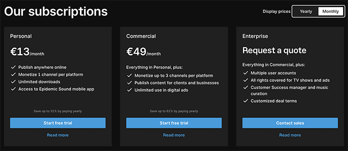 L’accesso alla libreria di Epidemic Sound รจ soggetto ad abbonamento. I costi sono variabili a seconda del tipo di utilizzo: nel momento in cui scriviamo il costo dell’abbonamento “Personal” รจ di 9 Eu / Mese, 19 EU / Mese per l’abbonamento “Commercial”. Epidemic Sound offre inoltre una prova gratuita di 30 giorni per gli utenti che desiderano provare il servizio prima di sottoscrivere un abbonamento.