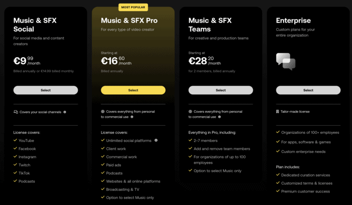Una delle caratteristiche principali di Artlist.io รจ la possibilitร di acquistare un abbonamento mensile che consente l’utilizzo illimitato di tutti i brani musicali presenti nel catalogo, senza alcun costo aggiuntivo (i costi variano a seconda dell’utilizzo a partire da 14,99 EU / Mese per la licenza “Music & SFX Social” che consente di utilizzare le tracce sui propri canali social).