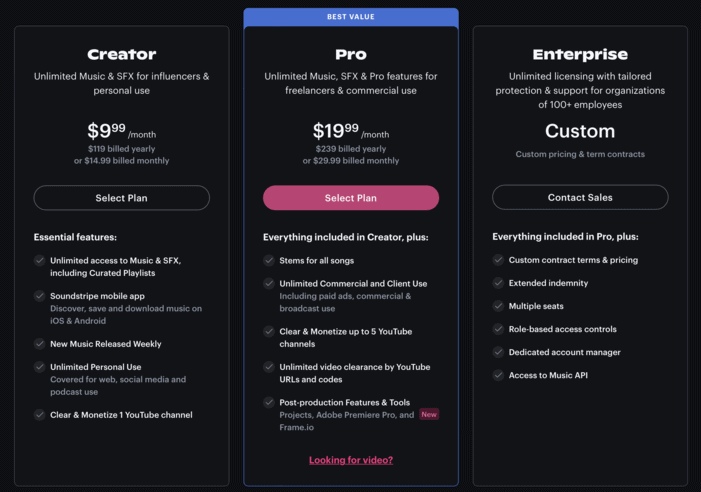 Una delle caratteristiche principali di Soundstripe รจ la possibilitร di acquistare una licenza annuale o mensile per utilizzare la musica in modo illimitato su qualsiasi progetto commerciale o personale.