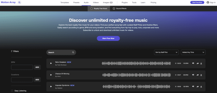 Motion Array offre anche diverse opzioni di ricerca per aiutare gli utenti a trovare il brano perfetto per il loro progetto, tra cui la ricerca per BPM e durata.