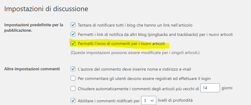 Si puรฒ modificare questa impostazione e quindi disabilitare o abilitare i commenti completamente (a livello di sito) oppure agire selettivamente su alcuni post e pagine (quindi รจ possibile, ad esempio, attivare i commenti e poi disabilitarli su singoli post o pagine).
