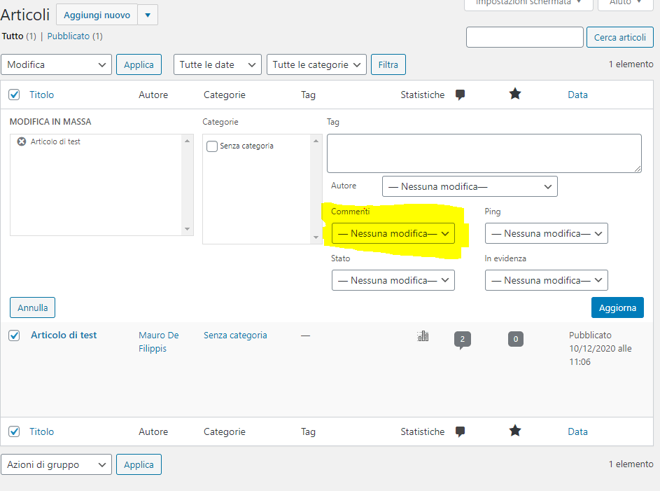 Si aprirร una nuova schermata Modifica in Massa in cui, tra le varie opzioni, ce ne una dedicata ai commenti. da questa tendina รจ possibile scegliere l’ opzione “Permetti” o “Non Permettere” per abilitare o meno i commenti sui post selezionati.