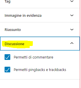 Sotto l’area di scrittura, รจ presente il blocco “Discussione”. Come รจ facile intuire da questโarea รจ possibile permettere o meno i commenti ed i pingback sullโarticolo che si sta modificando.