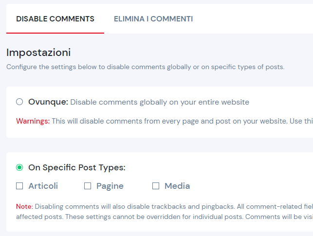 Per disabilitare i commenti si deve scegliere se farlo ovunque oppure su specifici post type (quindi Articoli, Pagine o Media). Le stesse opzioni si hanno per la cancellazione.