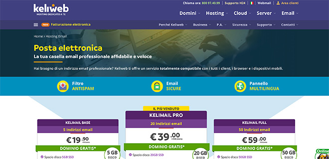 - Keliweb – offre diversi pacchetti di email hosting con possibilità di attivare caselle illimitate.