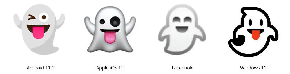 Ogni piattaforma (come iOS e Android, Dispositivo, App o Social Network) presenta variazioni di design per queste emoji, creando interessanti varianti visive a seconda del dispositivo utilizzato. Di seguito un esempio relativamente alla emoji del fantasmino: