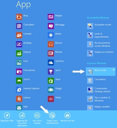 Una volta aperto l’elenco delle Apps, selezionate il Blocco Note e cliccate sul pulsante “Esegui come Amministratore”.