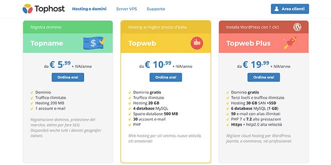 Quando si parla di hosting economico non può non essere menzionato Tophost, provider italiano rinomato per i suoi prezzi estremamente concorrenziali.