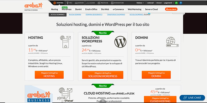- Aruba – offre diverse soluzioni a basso costo sia su OS Linux che Windows nonché piani ottimizzati per i più popolari CMS.