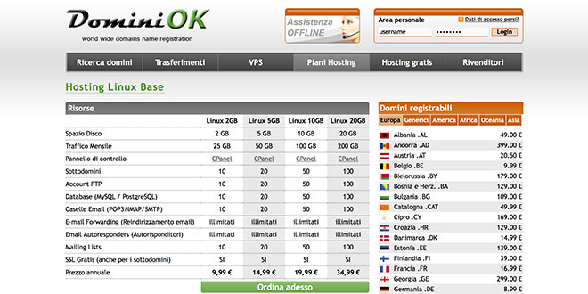 - DominioOK – offre diversi pacchetti hosting a partire da 5,99 Euro all’anno.