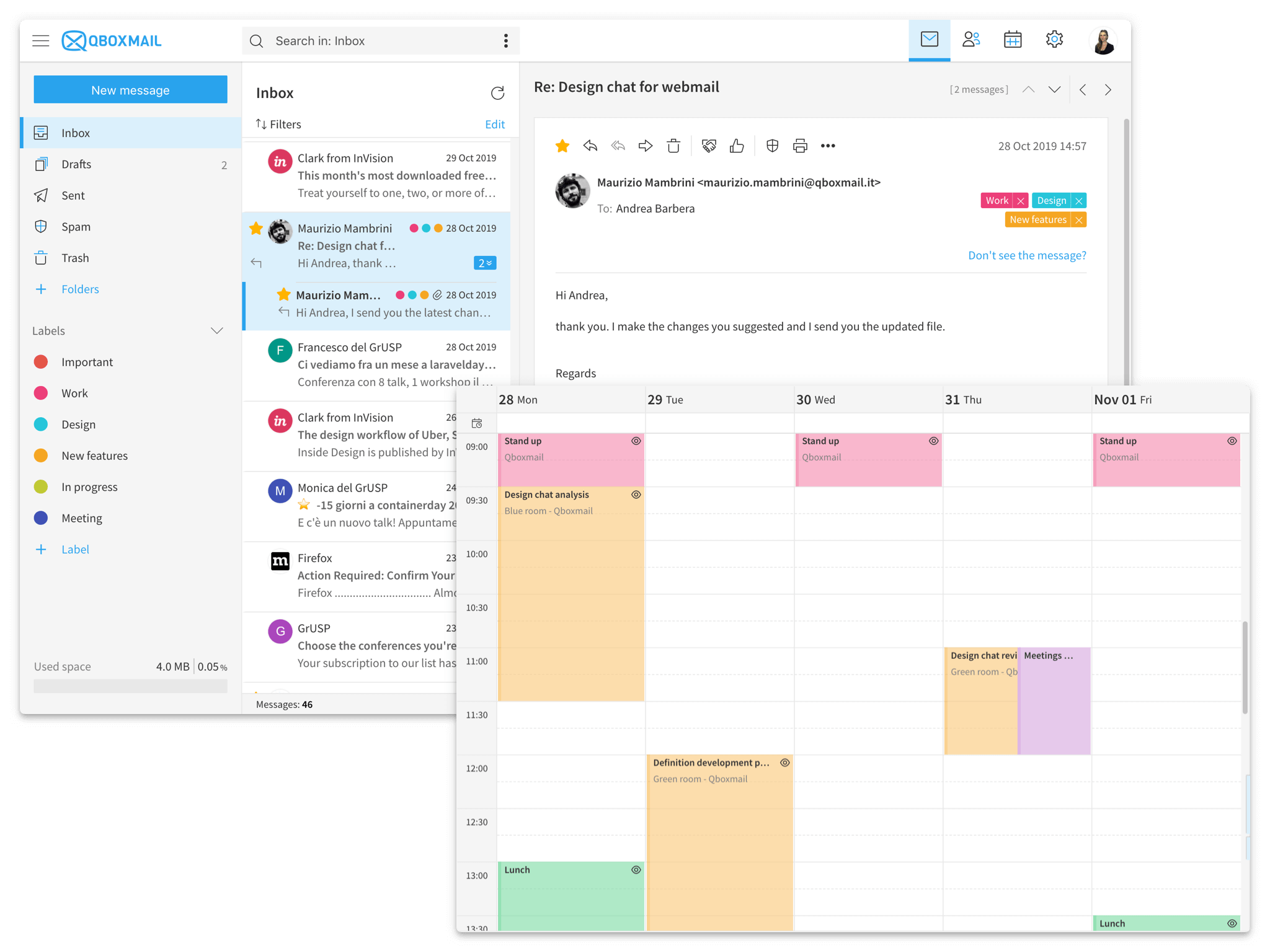 La Webmail di Qboxmail consente di avere sempre a disposizione i dati di cui si ha bisogno: cartelle di posta, rubriche aziendali e calendari sono sempre sincronizzati su tutti i device e condivisibili con i collaboratori.